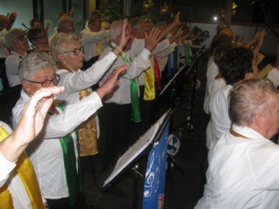 De zeemansmedley bracht de stemming er direct in. Ook de serieuzere nummers vonden gretig gehoor. Na de pauze was er gelukkig meer publiek en er werd meegezongen en ook een polonaise en een dansje zorgden voor veel gezelligheid.